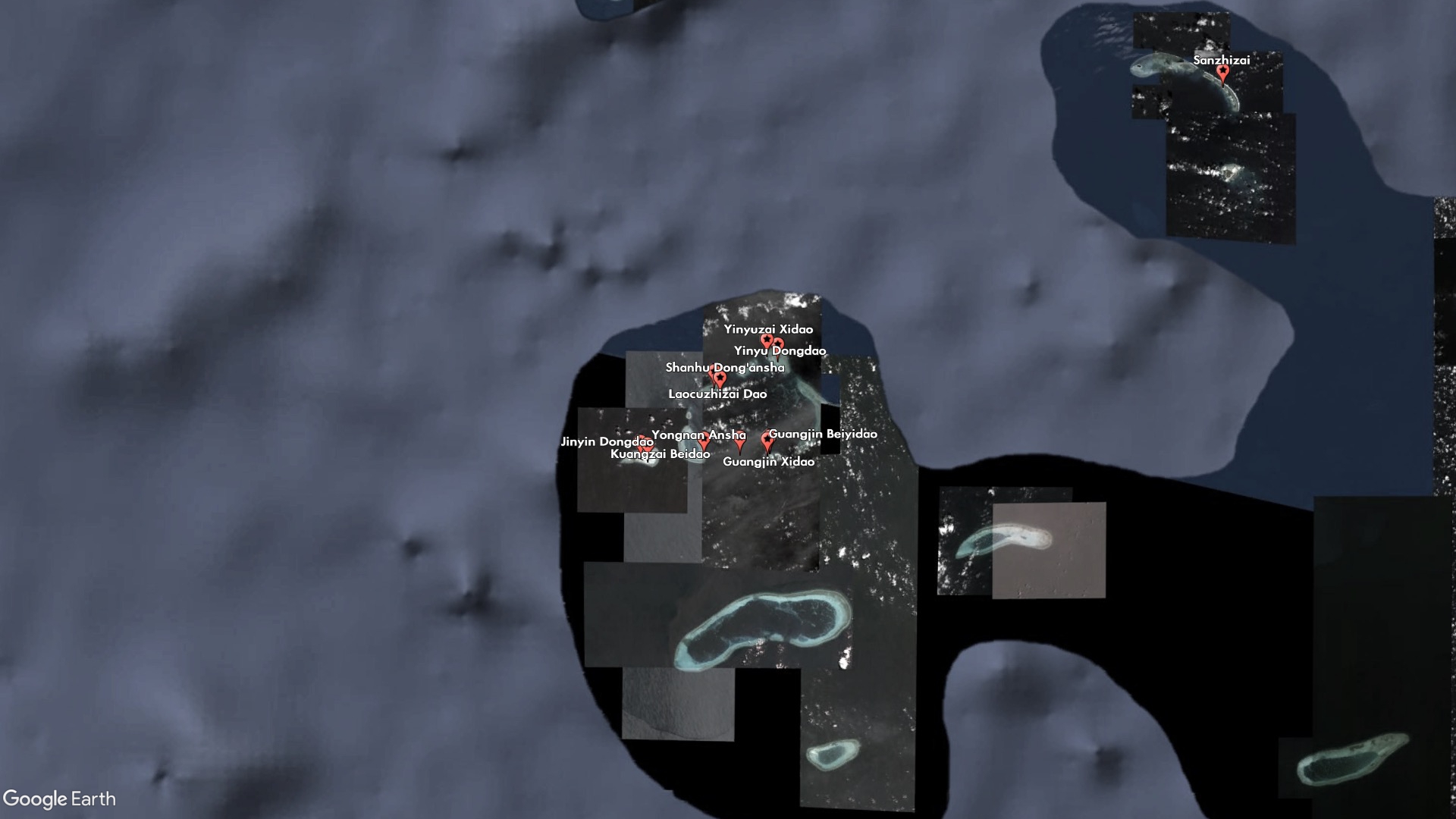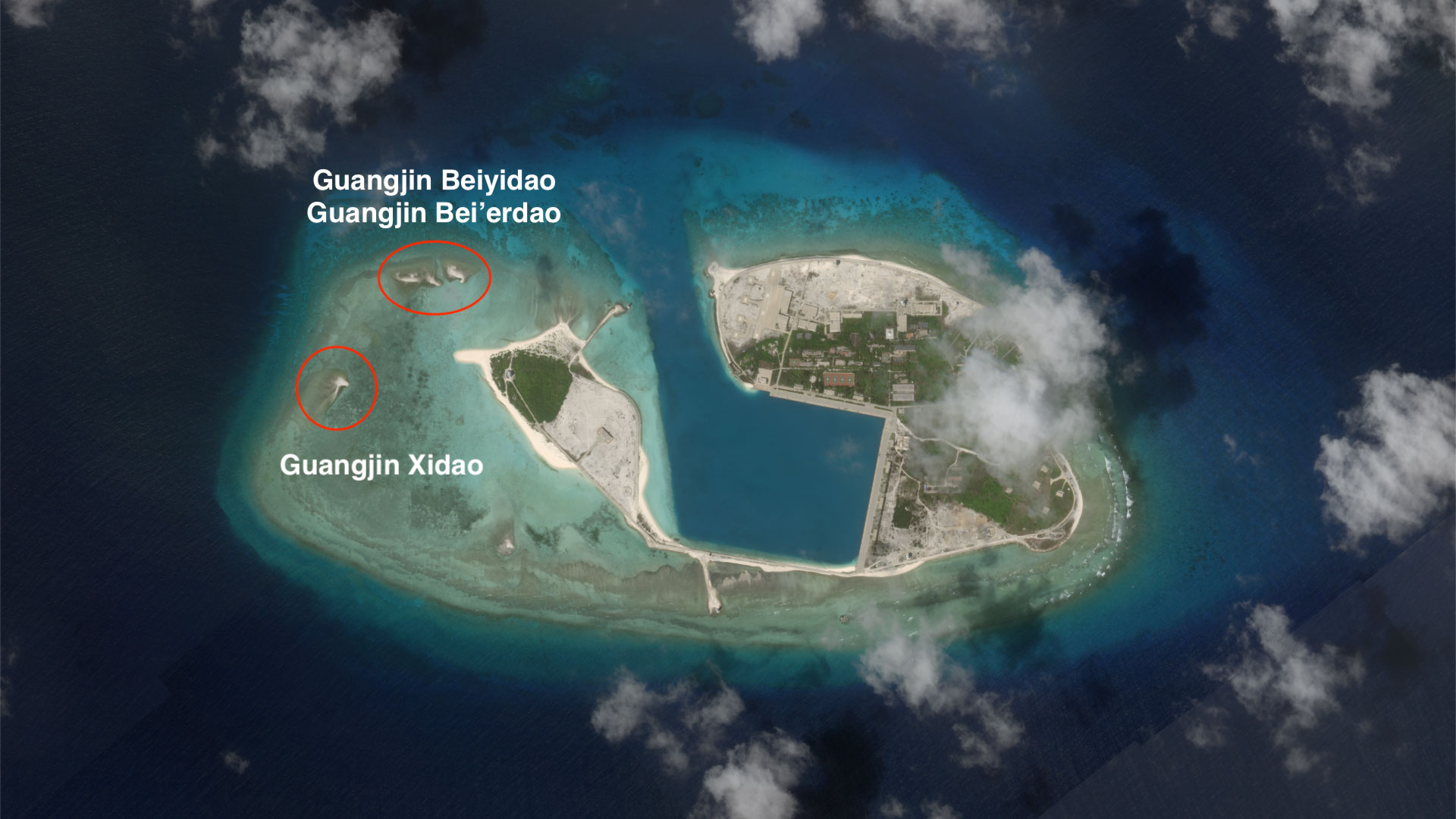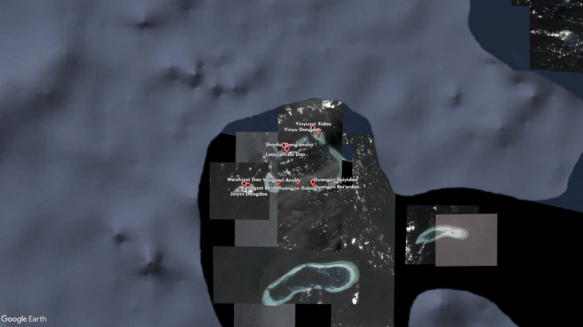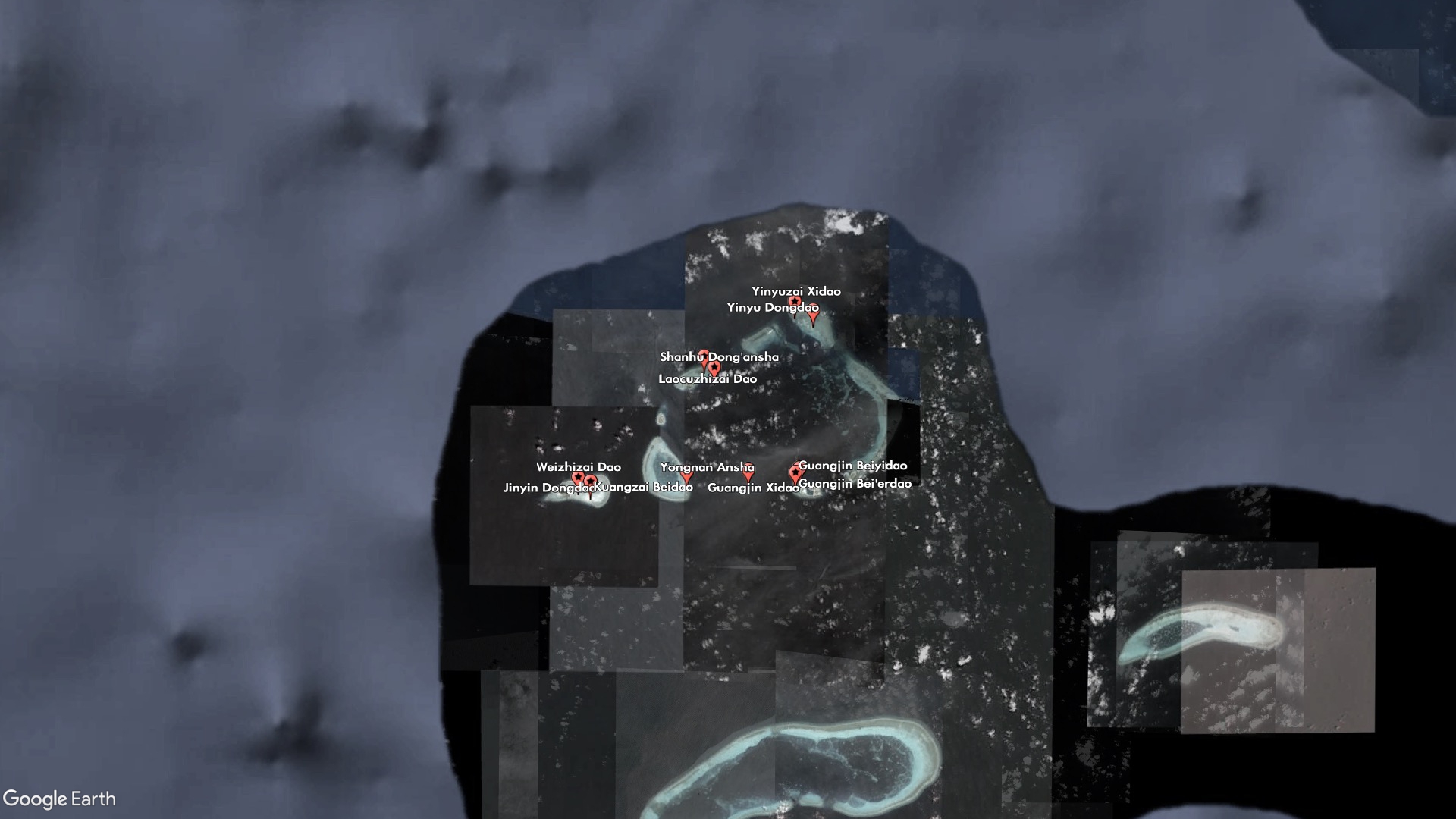 Other new features are clearly meant to plug the gaps between and around China's military outposts and artificial islands. Guangjin Beiyidao and Guangjin Bei'erdao (Guangjin North First Island and Guangjin North Second Island) are indistinguishable from each other, and China lists the same coordinates for both of them, but together with Guangjin Xidao (Guangjin West Island) they make up the small sand barrier on the western side of Duncan Island, which houses a Chinese-built harbor and outpost.