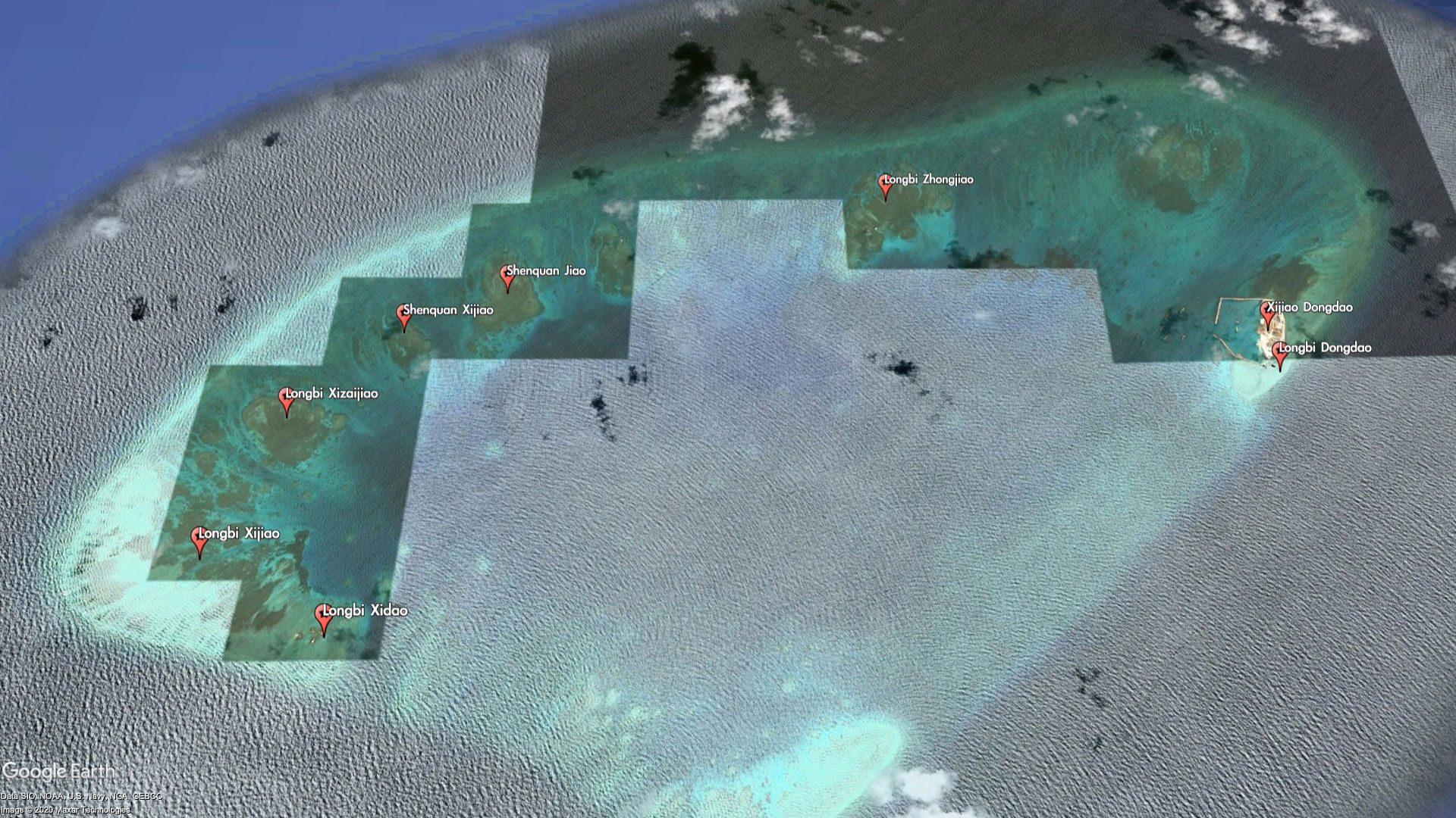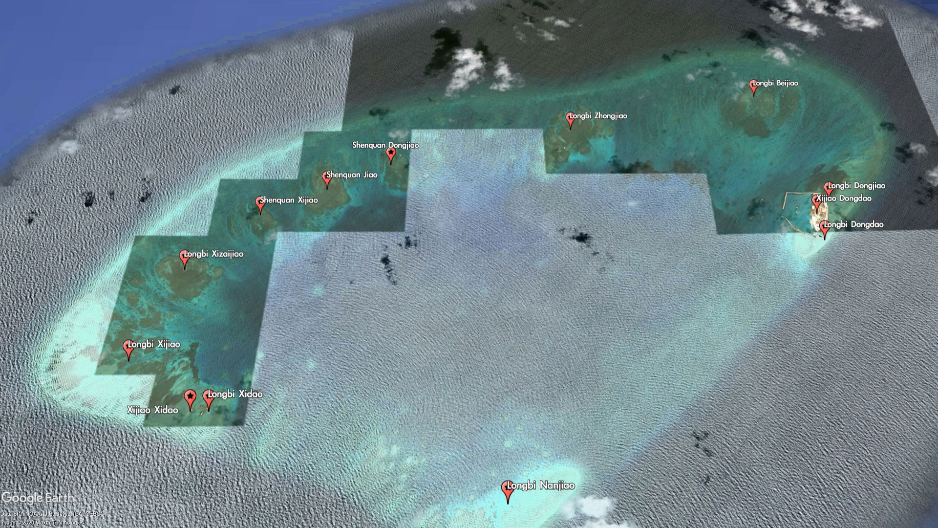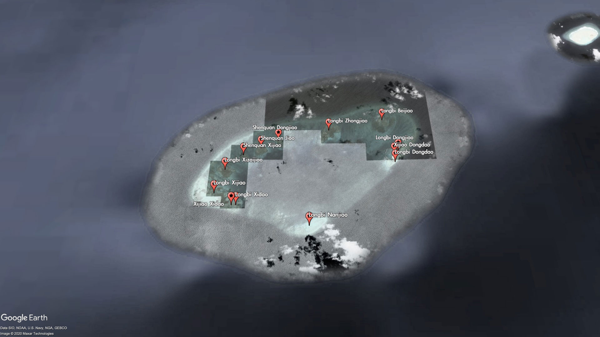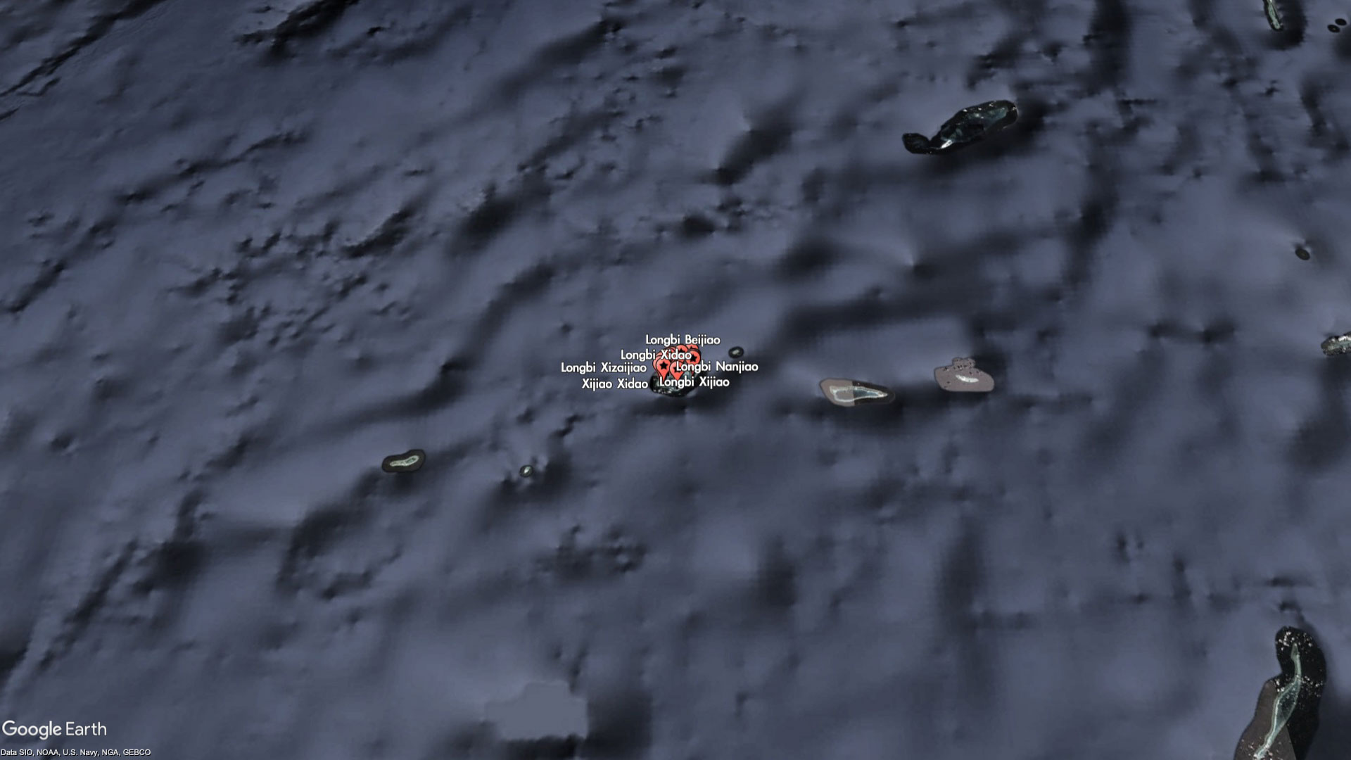 The entire reef itself is barely worth a name, but China has seen fit to label every bit of it - as part of the Xijiao (West Reef) and Longbi (Dragon's Nose) chain of "islands." For reasons that are unclear, some of the miniscule features are even labeled twice with different names. For example, Xijiao Dongdao (West Reef East Island) is also known as Longbi Dongdao (Dragon's Nose East Island), and Xijao Xidao (West Reef West Island) is also known as Longbi Xidao (Dragon's Nose West Island).