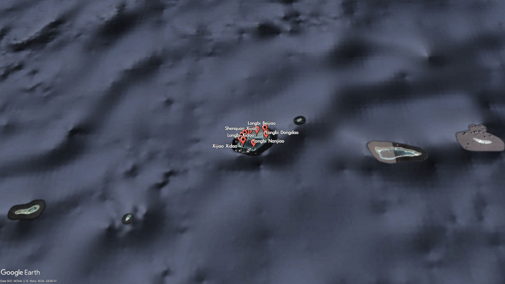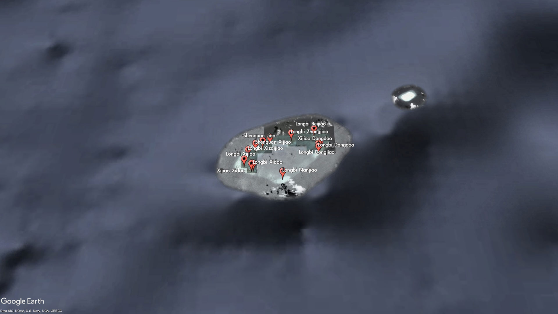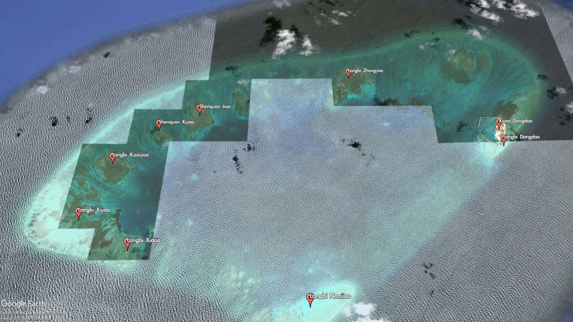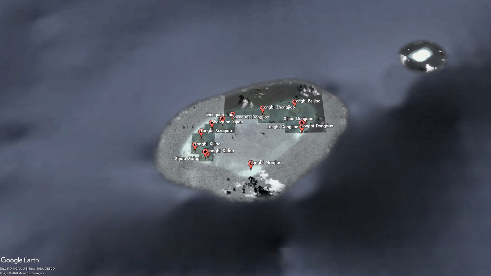 The entire reef itself is barely worth a name, but China has seen fit to label every bit of it - as part of the Xijiao (West Reef) and Longbi (Dragon's Nose) chain of "islands." For reasons that are unclear, some of the miniscule features are even labeled twice with different names. For example, Xijiao Dongdao (West Reef East Island) is also known as Longbi Dongdao (Dragon's Nose East Island), and Xijao Xidao (West Reef West Island) is also known as Longbi Xidao (Dragon's Nose West Island).