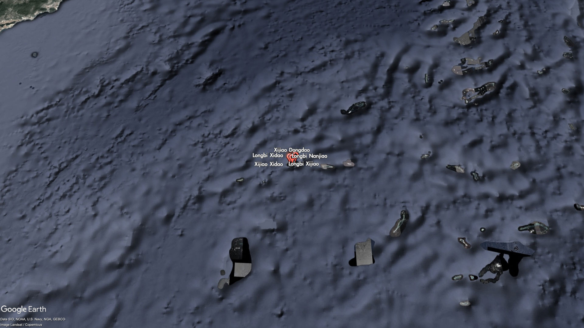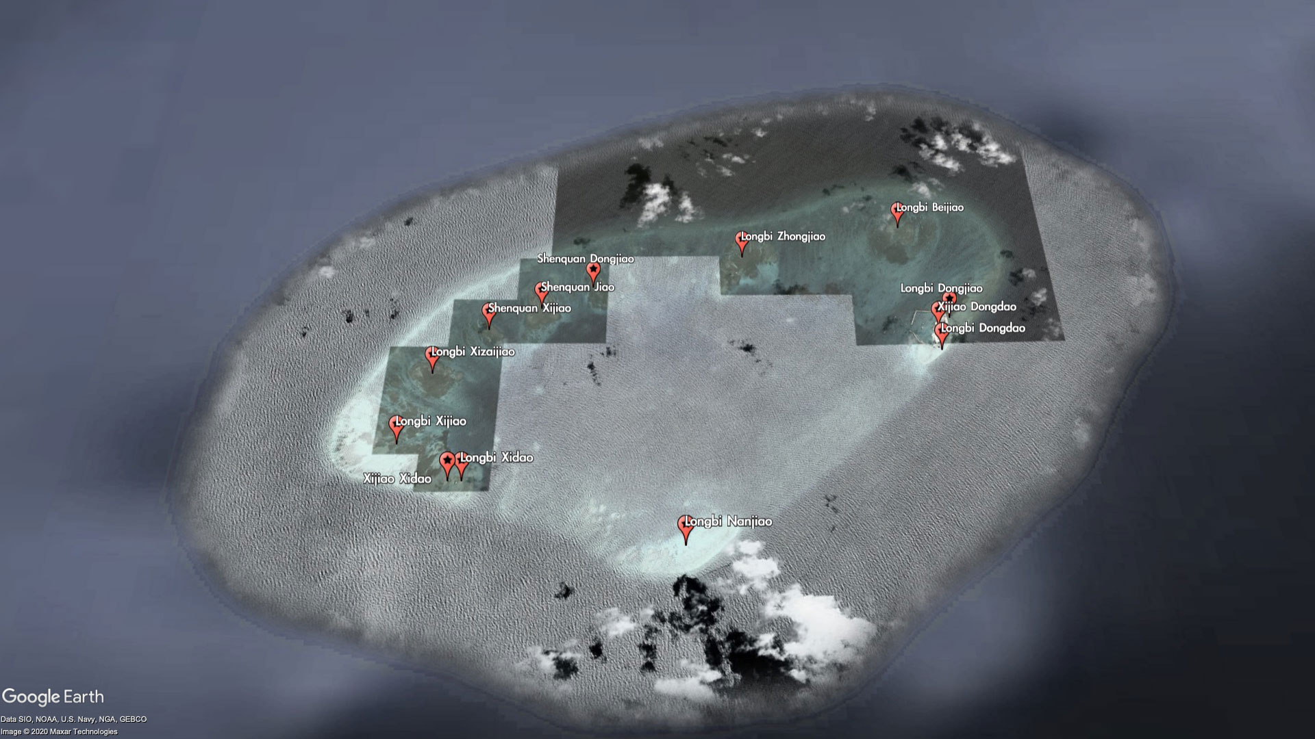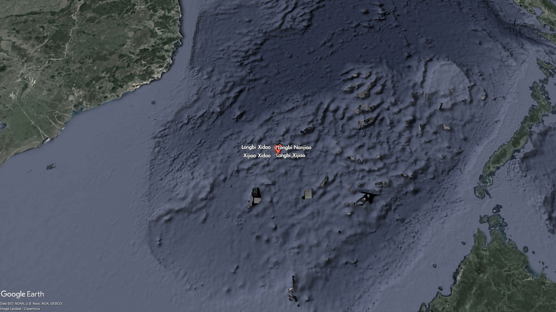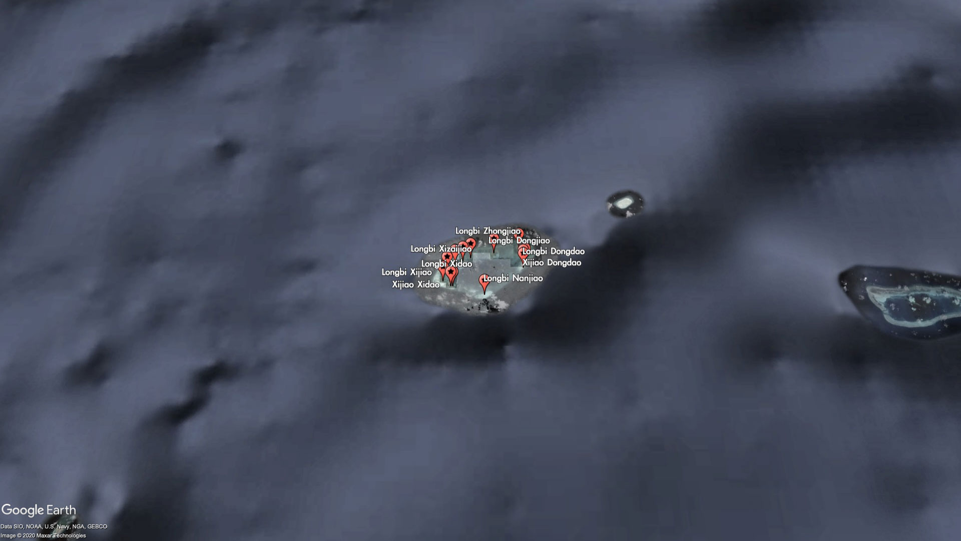 The entire reef itself is barely worth a name, but China has seen fit to label every bit of it - as part of the Xijiao (West Reef) and Longbi (Dragon's Nose) chain of "islands." For reasons that are unclear, some of the miniscule features are even labeled twice with different names. For example, Xijiao Dongdao (West Reef East Island) is also known as Longbi Dongdao (Dragon's Nose East Island), and Xijao Xidao (West Reef West Island) is also known as Longbi Xidao (Dragon's Nose West Island).