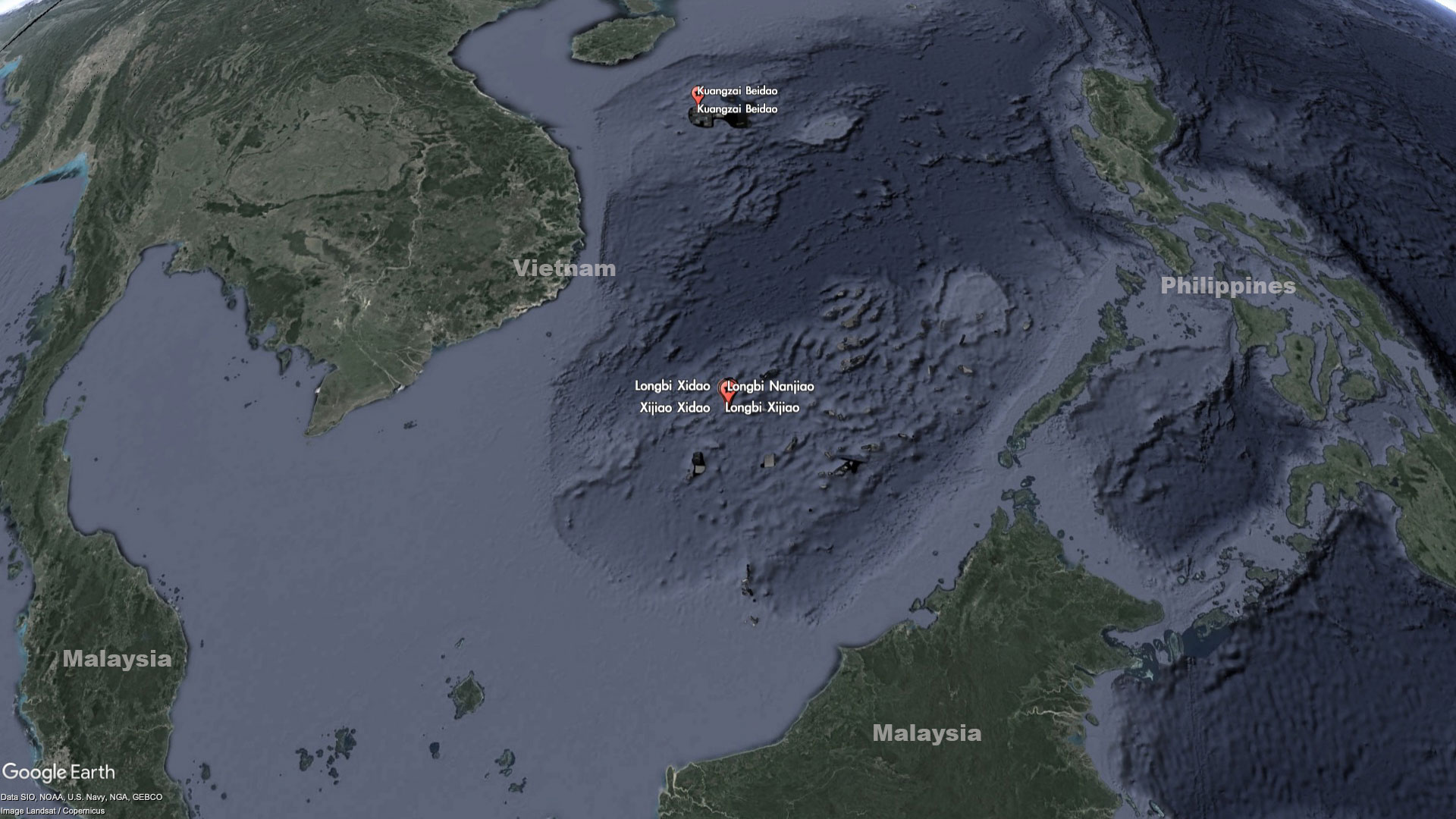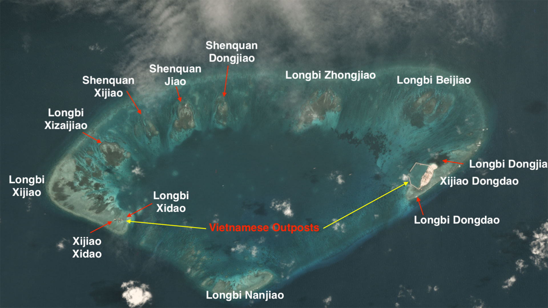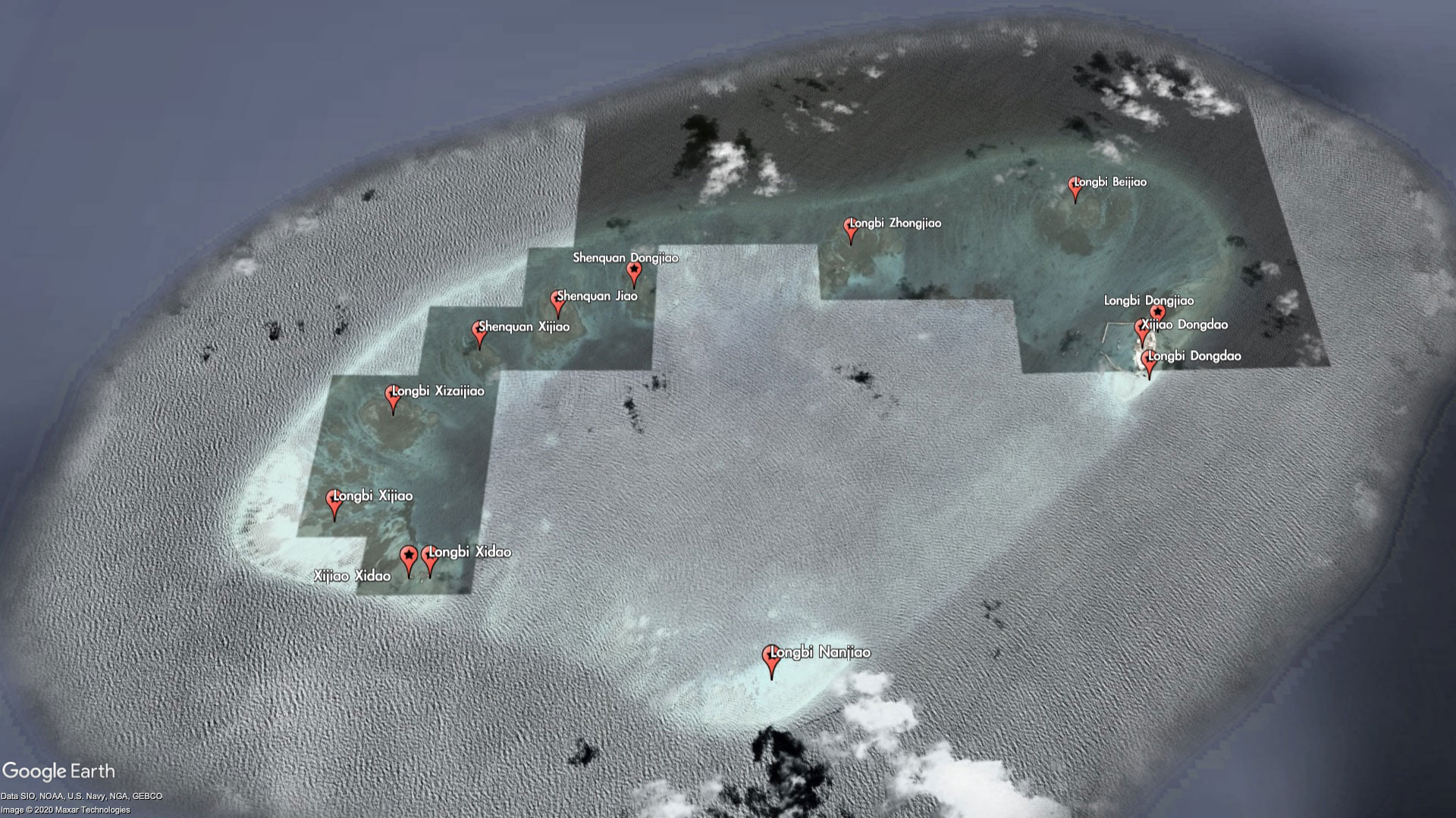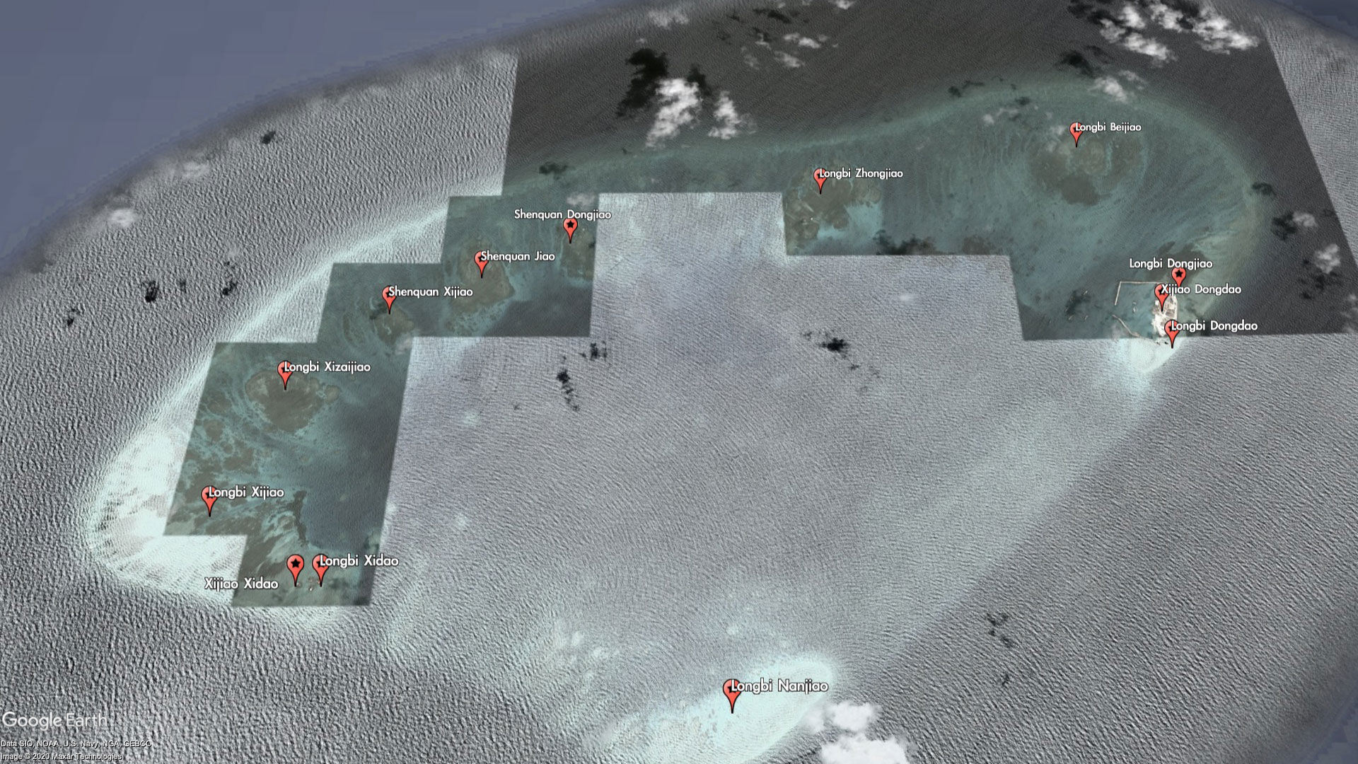 The entire reef itself is barely worth a name, but China has seen fit to label every bit of it - as part of the Xijiao (West Reef) and Longbi (Dragon's Nose) chain of "islands." For reasons that are unclear, some of the miniscule features are even labeled twice with different names. For example, Xijiao Dongdao (West Reef East Island) is also known as Longbi Dongdao (Dragon's Nose East Island), and Xijao Xidao (West Reef West Island) is also known as Longbi Xidao (Dragon's Nose West Island).